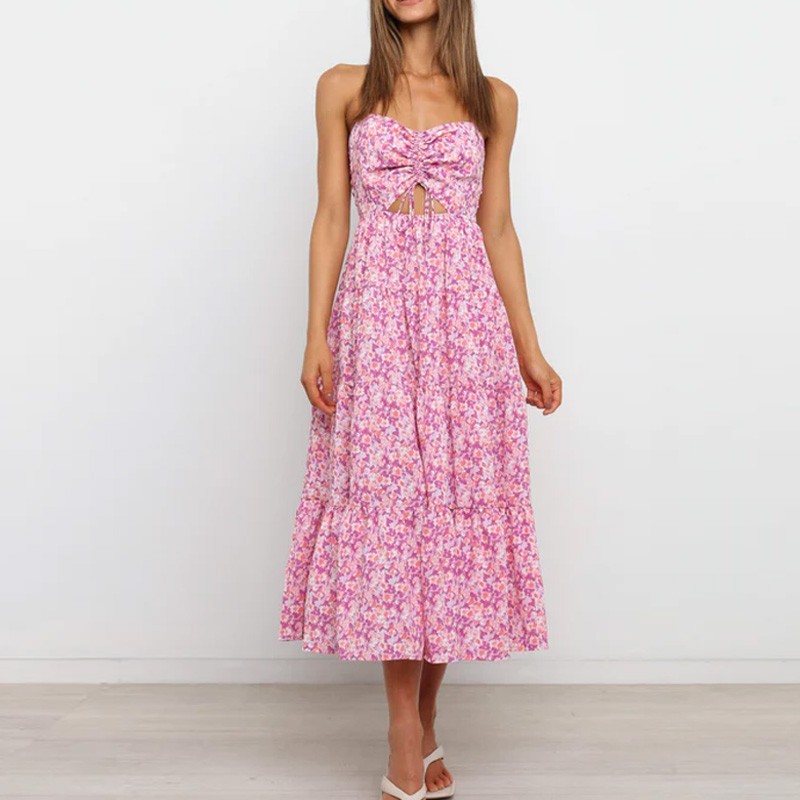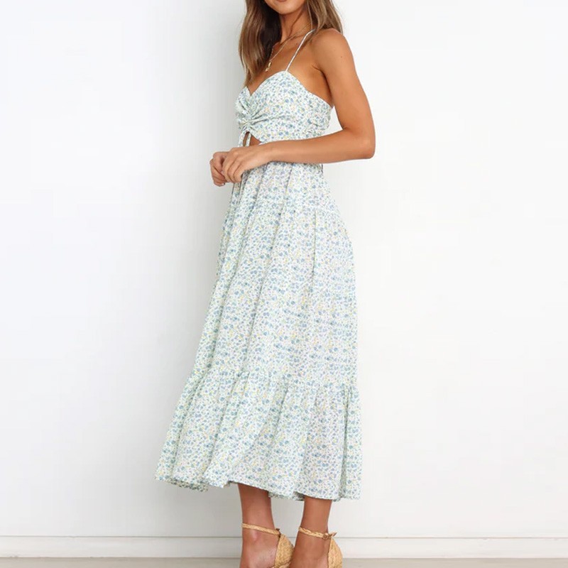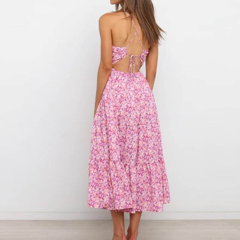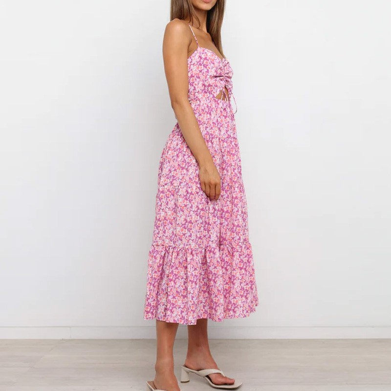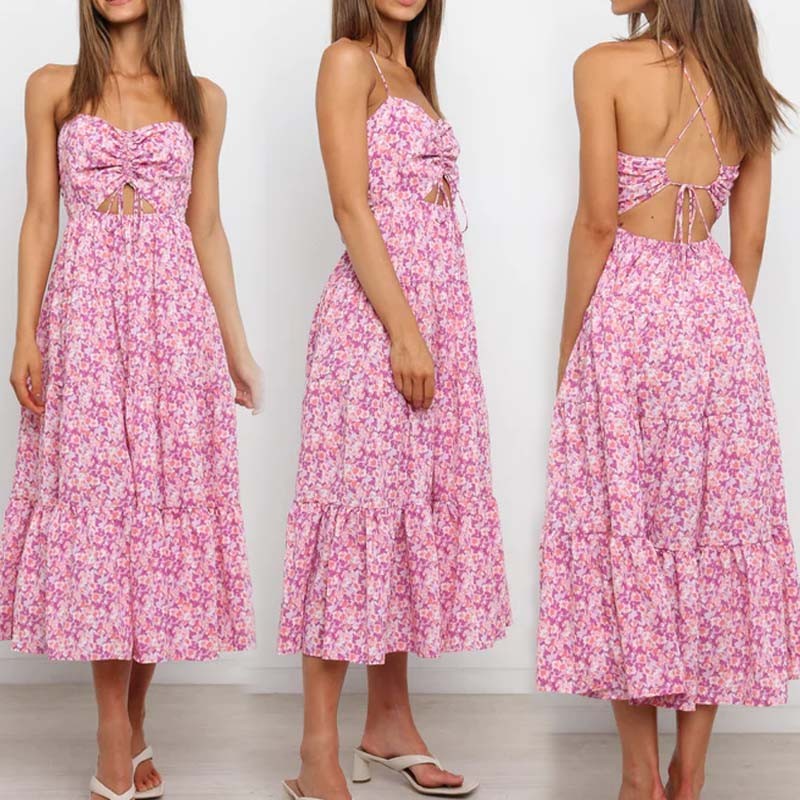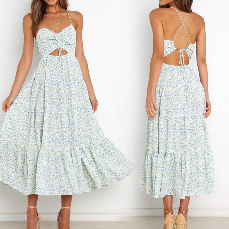Fashion Floral Sexy Backless Lace-up Design Casual Empire Waist A-Line Midi Dress