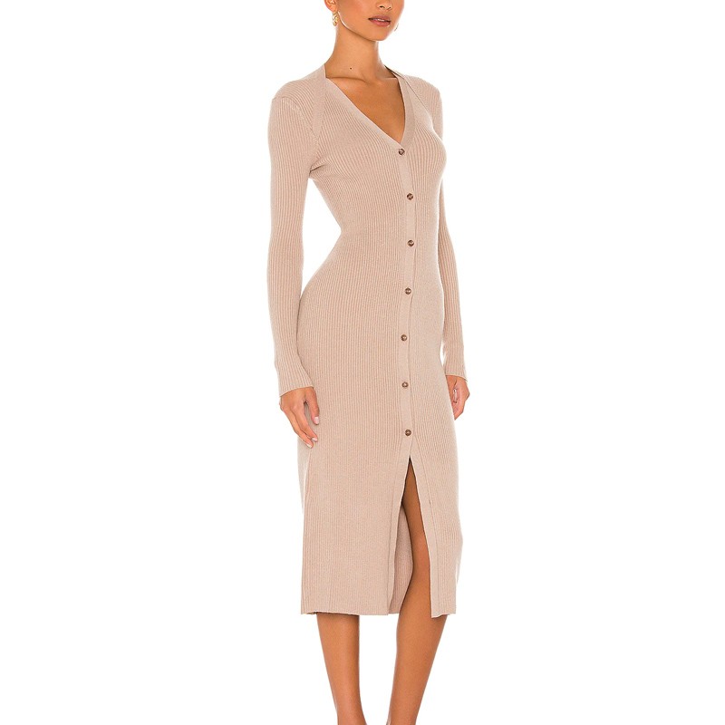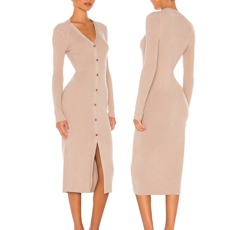Fall Long Sleeve V Neck Single-Breasted Slim Knit Midi Dress