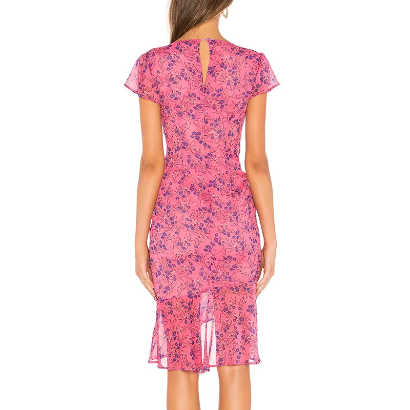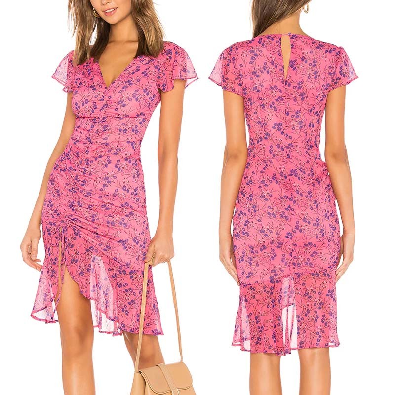 Summer Flutter Sleeve V Neck Flower Bodycon Knee-High Dress