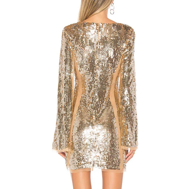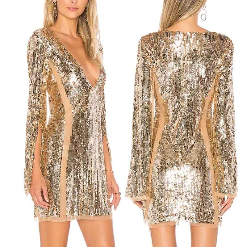 New Fashion Sexy Deep V Neck Gold Sequin Long Sleeve Slim Mini Dress
