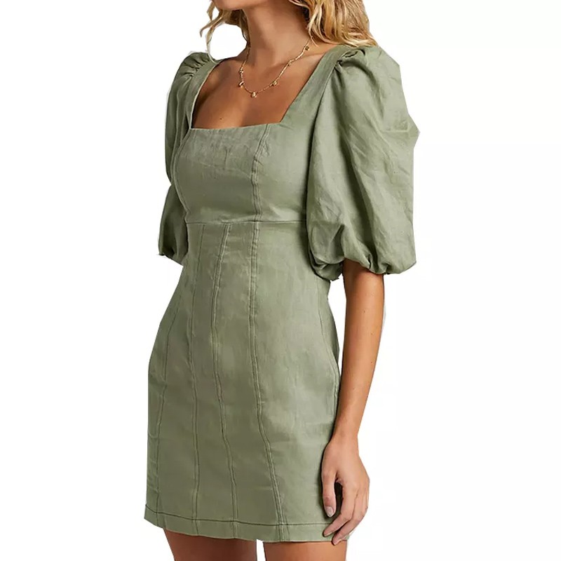 Women Square Collar Puff Sleeve Solid Color Linen Mini Dress