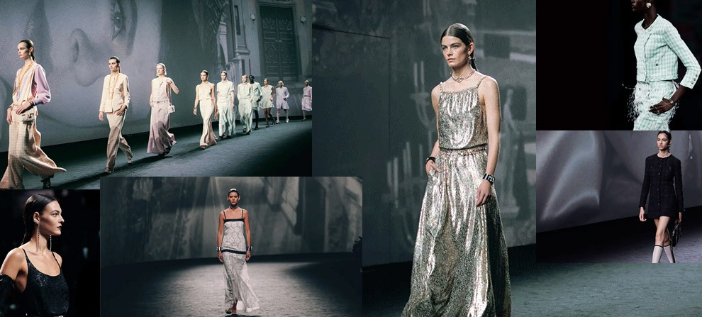 CHANEL's show at the temporary pavilion of the Grand Palais in Paris was transformed into a circular cinema, with clips from the classic film "Last Year at Marienbad" by Alain René showing on the ring screen.