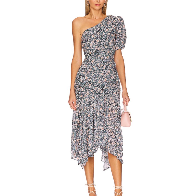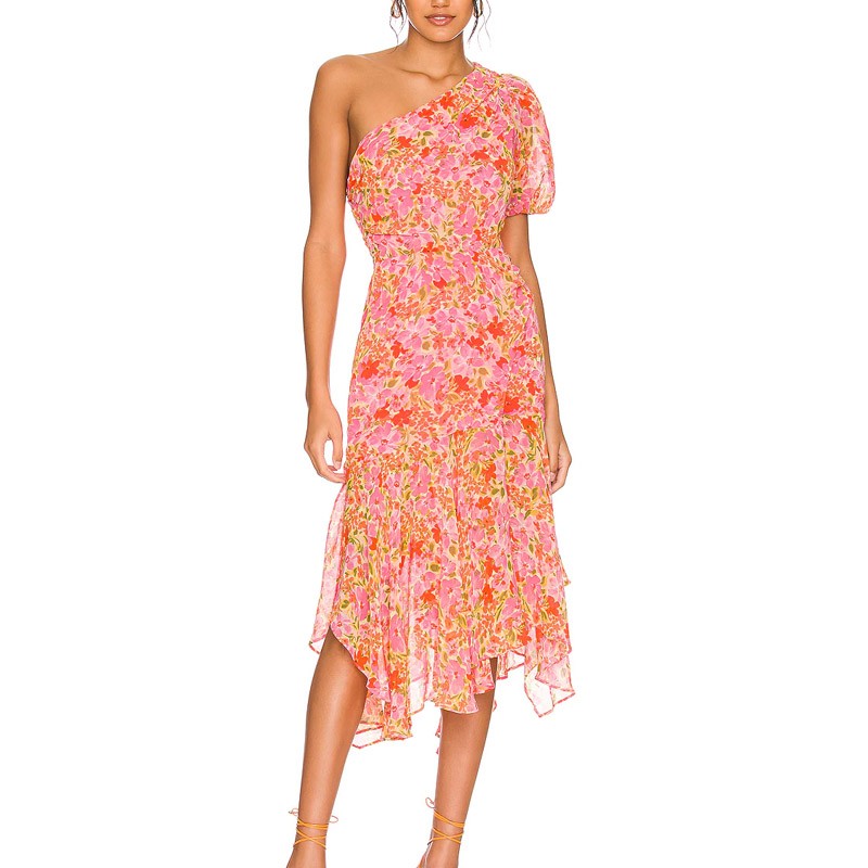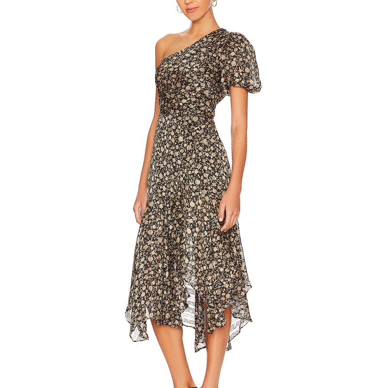 Summer One Shoulder Puff Sleeve Asymmetrical Hem Design Style Fitted Dresses