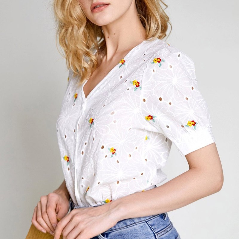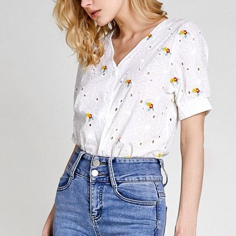Fashion White Casual Short Sleeve Embroidery Blouse