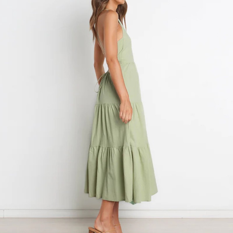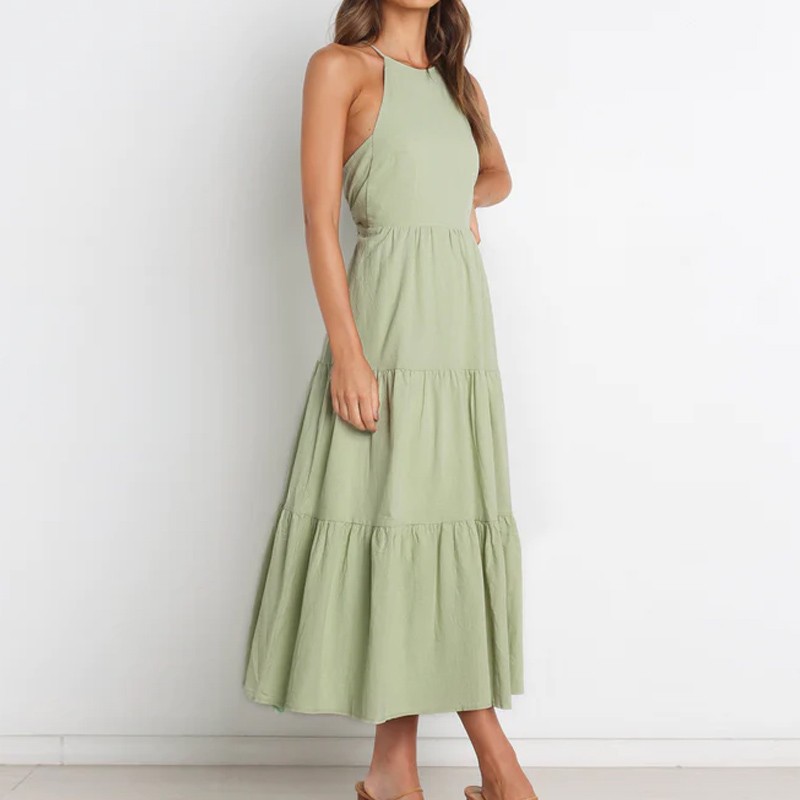 Womens Halter Sexy Backless Lace-up Design Solid Color Midi Dress